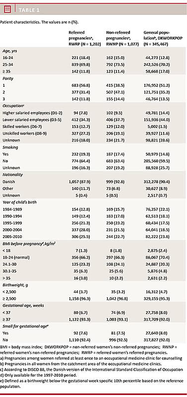 Assuming that women referred to counselling at an occupational health clinic have a more hazardous occupational work environment than pregnant women in general, we examined the risk of preterm birth, low birthweight, and small for gestational age in this group.