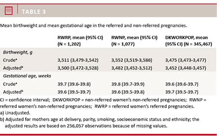 Results: Referred women gave birth to children with a higher birthweight than the average employee (difference 47.8 g; 95% CI: 19.9-75.6), but the outcomes did not differ with respect to gestational age (difference 0.05 weeks; 95% CI: –0.06-0.17), preterm delivery (OR: 0.8; 95% CI: 0.62-1.04), LBW (OR: 0.81; 95% CI: 0.52-1.26) or SGA (OR: 0.92; 95% CI: 0.72-1.17).