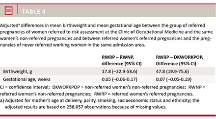 No difference between the pregnant women who were referred to occupational risk assessments and the same women’s non-referred pregnancies was found,