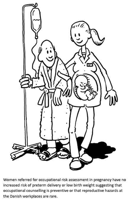 According to the Danish Executive Order on the Performance of Work (Executive Order No. 559 of 17 June 2004), the employer is responsible for ensuring a safe working environment. If a harmful reproductive hazard is present and if preventive measures or reassigning the worker to a safe job is not possible, healthy pregnant women may obtain social benefits. Some 3-4% of all cases of pregnancy leave in Denmark are due to such situations [2]. A manual from the Danish Working Environment Authority (AT-guidance A.1.8 of January 2009) describes the impacts that are likely to endanger pregnancy [3]. If the general practitioner or midwife assesses that the woman’s working conditions may pose a risk to the pregnancy, the pregnant woman may be referred to the regional clinic of occupational health for occupational risk assessment. This usually happens between 8 and 12 weeks of gestation. The referred pregnant woman should be repositioned or be granted sick leave until the risk assessment has been carried out.