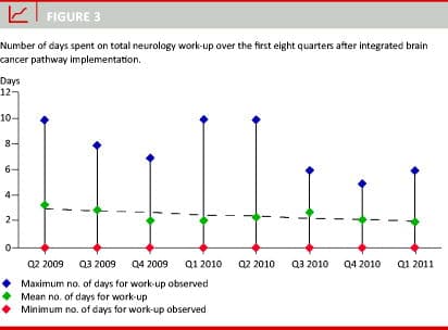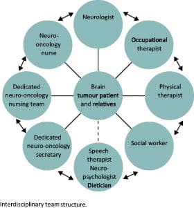 The local in-hospital environment for treatment and rehabilitation was already specialized before the implementation of the IBCP but further optimization of the illness trajectory through changes in the organization of the patient flow and in the diagnostic work-up and follow-up processes were possible. Thus, brain cancer has enjoyed a high priority on the local hospital agenda in recent history as a multidisciplinary pathway plan has been created for this disease entity. The brain cancer plan was created at a department level and it details the optimal mono- and cross-disciplinary courses of action in all phases of the illness trajectory, from referral to palliation. As a natural consequence of this project, a local multidisciplinary neuro-oncology team was established that involved specialist physicians, nurses, neuro-psychologists, dieticians, social workers and physical, occupational and speech therapists. This team structure ensures the ongoing optimal care and treatment in the very early phases and in the rehabilitation and palliative phases of the brain cancer journey. The importance of a multidisciplinary team structure for complete management of the patient suffering a malignant brain tumour is significant and has previously been described [7, 8]. This paper focuses on the referral pattern and on the time frame of the different initial pathway elements in the initial two-year period following the implementation of the IBCP.