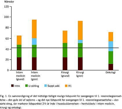 I Fig. 2 er specialerne arbejdsmedicin, samfundsmedicin, klinisk farmakologi og klinisk genetik ikke med, fordi det i den gamle speciallægeuddannelse ikke var fastlagt, om uddannelsen skulle foregå som reservelæge eller 1. reservelæge. Men der er tale om en markant forbedring i forhold til tidligere.