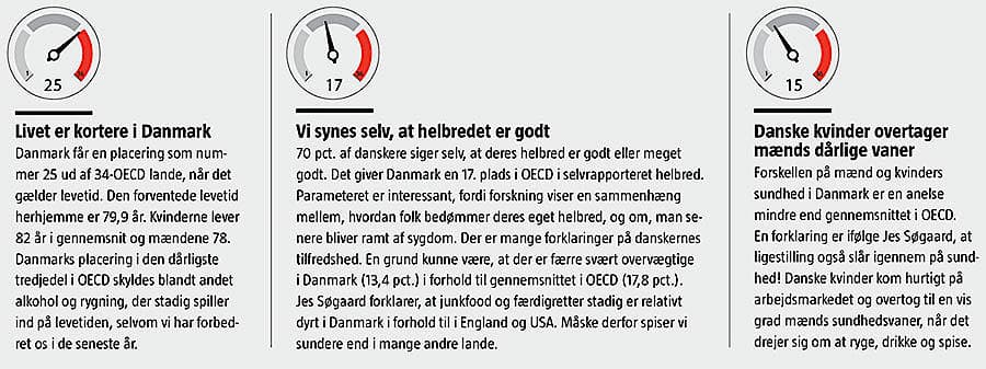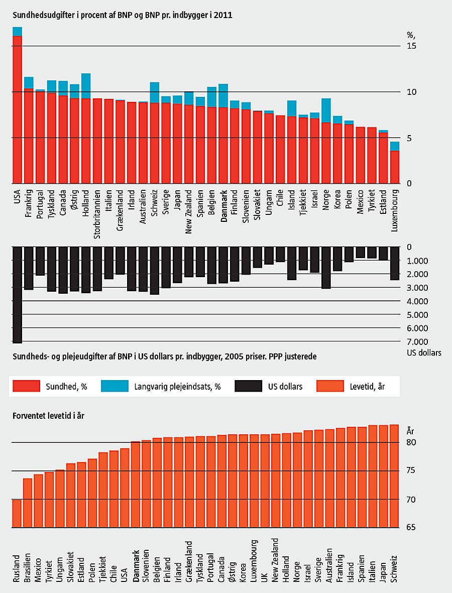 En række lande i OECD har øget sundhedsudgifterne mere end Danmark i de seneste år. Fra 2000 til 2009 steg sundhedsudgifterne i Danmark med 3,6 pct. pr. år, mens gennemsnittet for OECD var 4,7 pct. I 1970’erne var Danmark et af de lande i OECD, der brugte flest penge på sundhed i forhold til BNP, men nu har Danmark en placering som nummer 19, hvis man ser på rene sundhedsudgifter fraregnet udgifter til hjemmehjælp, forklarer Jes Søgaard, professor i sundhedsøkonomi på Aarhus Universitet. »De danske amter og nu regioner har så effektivt styret sundhedsudgifterne, at man selv som økonom somme tider spørger sig selv, om danskerne får adgang til den nyeste teknologi og behandling, siger han. Ser man på sundhedsudgifter pr. indbygger, lå Danmark som nummer 14 i OECD i 2011.