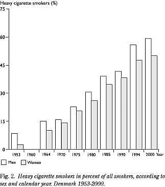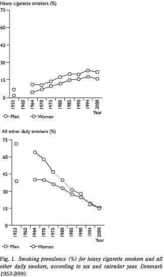 For smårygerne er billedet helt anderledes med et jævnt fald siden 1950'erne (Fig. 1). For mændene har der været et meget kraftigt fald fra næsten 75% til 15%, for kvinderne et mere moderat fald fra omkring 40% i starten af perioden til 15% i 2000. Den store forskel mellem mænd og kvinder er altså gradvist blevet mindre, og i sidste halvdel af 1990'erne er der ingen forskel.