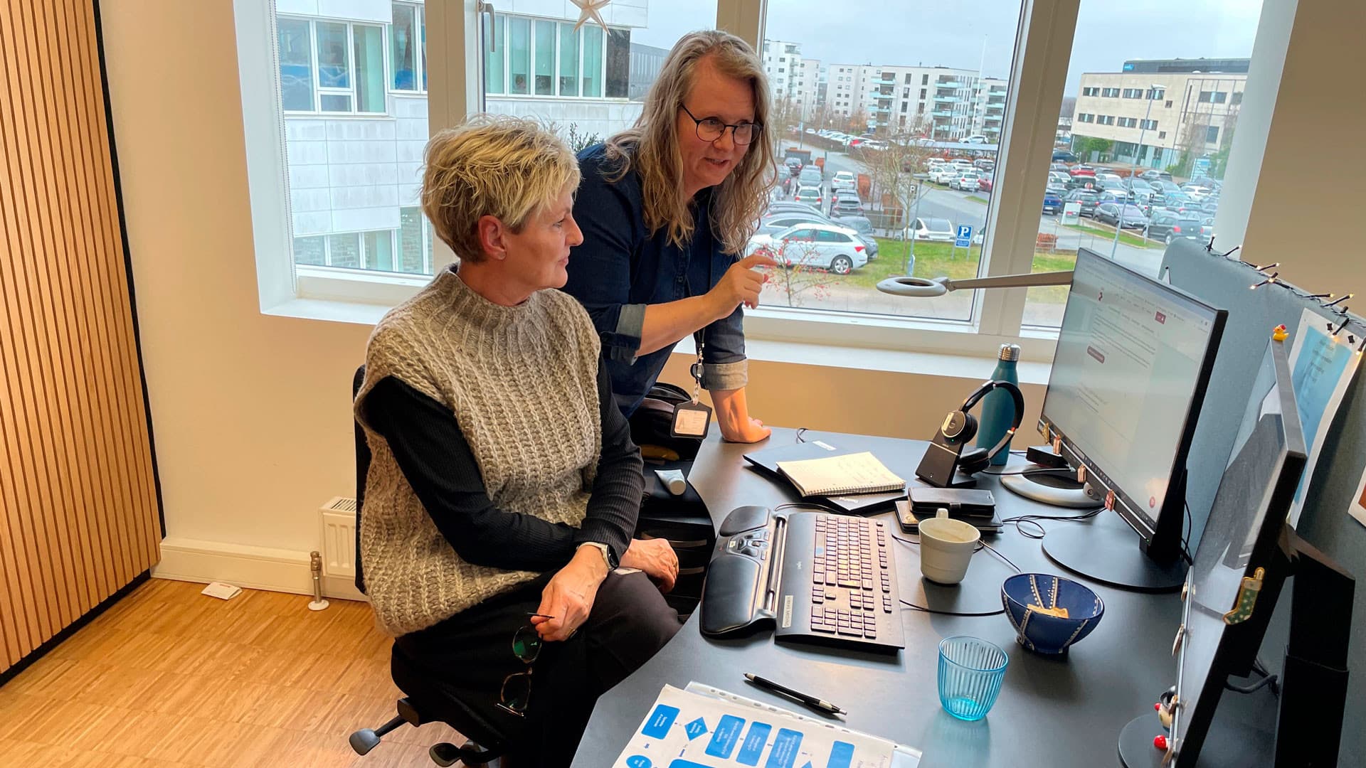 08.15 På plads på kontoret for sundhedsfaglige og sagkyndige (SOS). Vi har åbent kontor, og i dag er vi fem på kontoret – resten arbejder hjemmefra i dag. Jeg har ingen driftsopgaver i dag – dem dækker tre af kollegerne på kontoret.