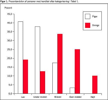 Resultaterne af den nordjyske pendulløbetest fremgår af Figur 1 . Resultaterne af testen er kategoriseret i kategorierne: Lav, under middel, middel, over middel og højt. Det er bemærkelsesværdigt, at der blandt pigerne kun er godt 21%, der tilhører kategorierne middel og derover. Dvs. mere end 78% af pigerne er under middel, og kategorien lav er den største kategori blandt pigerne. Drengene er mere normalfordelte omkring middel. Det ses dog hos drengene, at der i modsætning til normalfordelingen er for mange i kategorien lav.