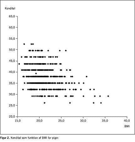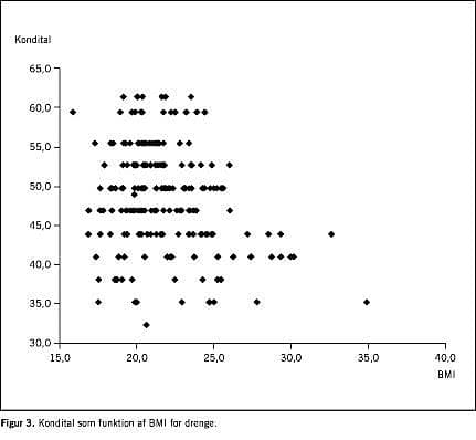 At dårlig kondition hænger sammen med fedme ses af Figur 2 og Figur 3 . Det er tydeligt, at de personer, der har et højt BMI, samtidig har en dårlig kondition. Dette gælder for begge køn. Både piger og drenge med et BMI over 30 har således alle et kondital under middel.
