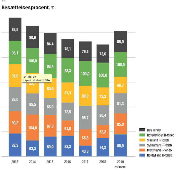 Tidligere så det bedre ud i Region Sjælland, hvor besættelsesprocenten i H-forløb lå på omkring 80 til og med 2017. I 2018 var den faldet til 72,3 (56 opslået, 45 besat) og i 2019 altså 66,7.