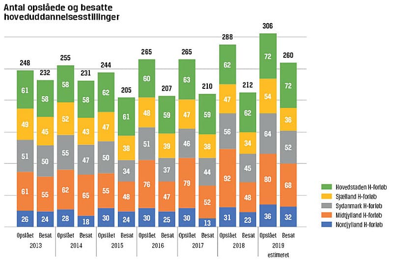 I år ser det ud til, at der samlet i hele landet vil blive slået 306 hoveduddannelses (H)-forløb op. Af dem bliver de 260 efter alt at dømme besat. Det er en pæn fremgang i forhold til 2018, hvor der blev slået 288 stillinger op, og de 212 blev besat (se kurve).