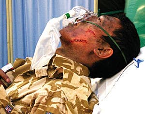 De sodsværtede tilskadekomne er ramt af en vejsidebombe. En har fået det nederste af højre ben revet helt af. På en anden er venstrebenet hårdt læderet, og foden drejer udad i en unaturlig vinkel. Han jamrer forpint og ryster ukontrolleret. En tredje har - tilsyneladende - kun overfladiske skrammer. Han kan gå selv men er i chok.