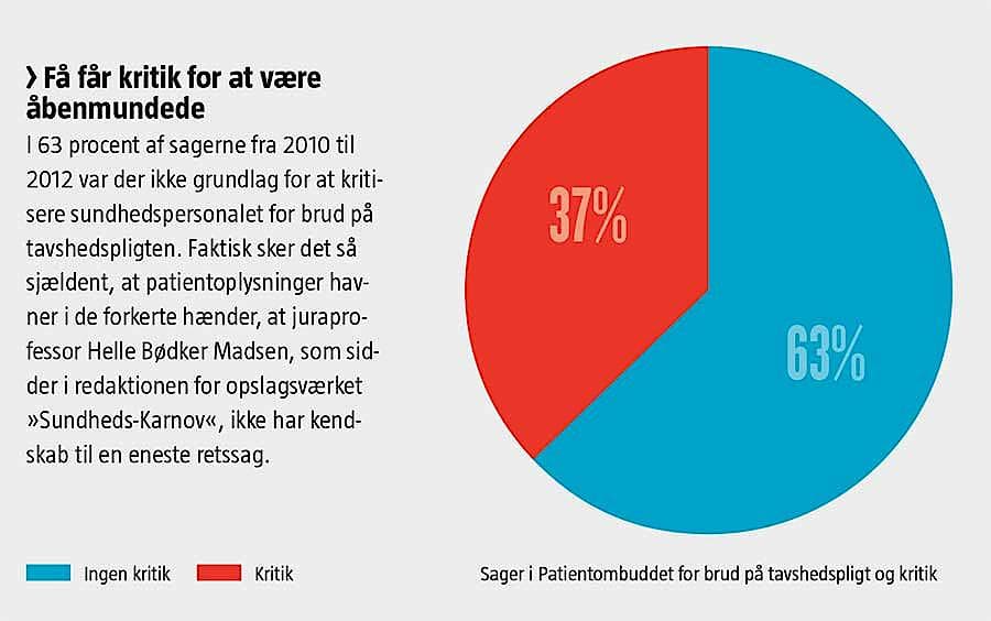 I 63 procent af sagerne fra 2010 til 2012 var der ikke grundlag for at kritisere sundhedspersonalet for brud på tavshedspligten. Faktisk sker det så sjældent, at patientoplysninger havner i de forkerte hænder, at juraprofessor Helle Bødker Madsen, som sidder i redaktionen for opslagsværket ”Sundheds-Karnov”, ikke har kendskab til en eneste retssag.