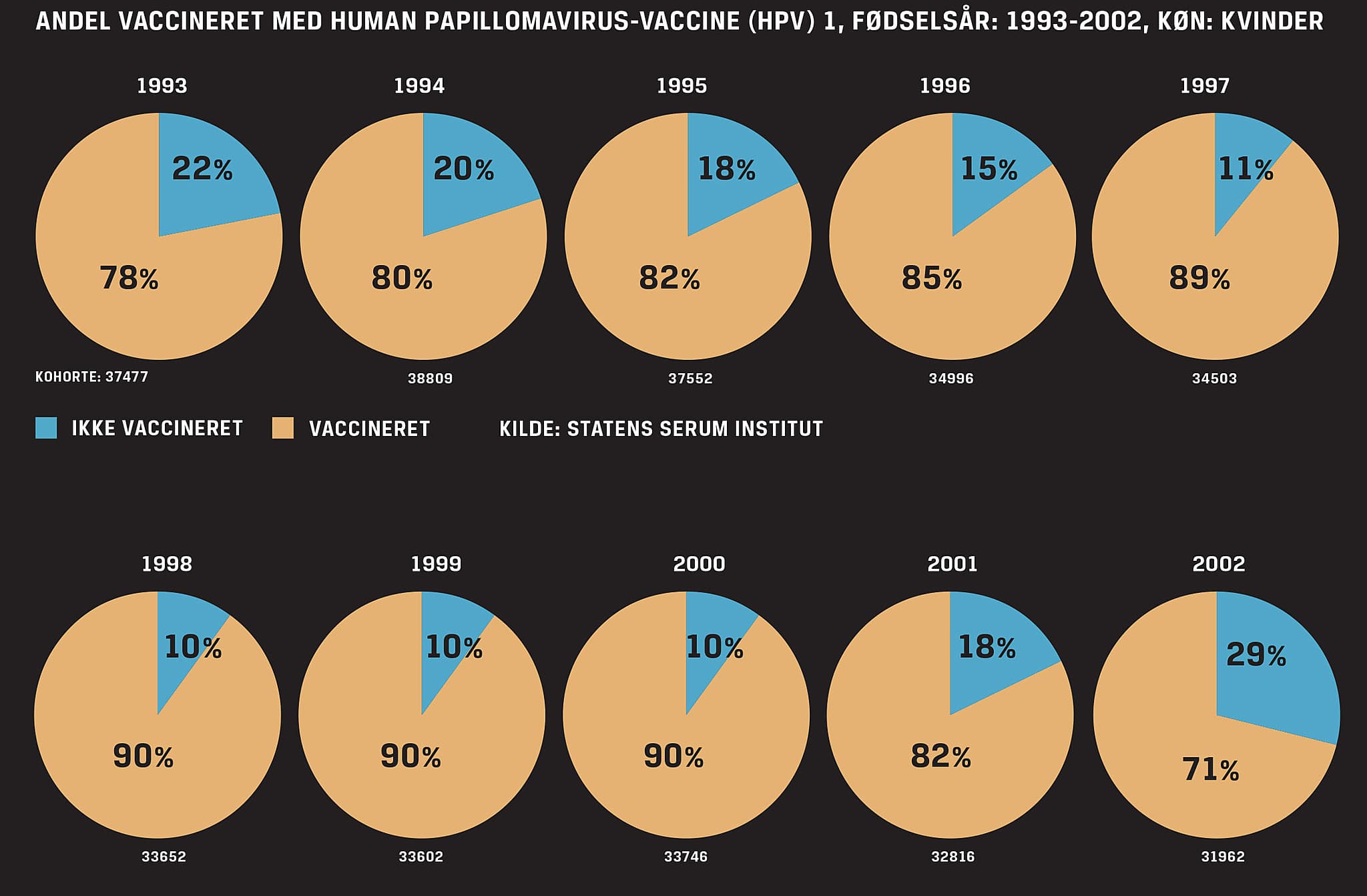 Men Sundhedsstyrelsen har hele tiden anbefalet vaccinen – og gør det fortsat – fordi fordelene ved vaccinationen er langt større end ulemperne. For nylig slog Det Europæiske Lægemiddelagentur (EMA) fast, at der ikke er nogen større forekomst af bivirkningerne posturalt ortostatisk takykardisyndrom (POTS) og komplekst regionalt smertesyndrom (CRPS) blandt HPV-vaccinerede end i befolkningen generelt.