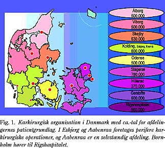 Udsprunget fra enten thoraxkirurgiske eller urologiske afdelinger blev dansk karkirurgi et kirurgisk grenspeciale i 1983 med eget videnskabeligt selskab, og fra 1994 er alle karkirurgiske operationer blevet udført på karkirurgiske specialafdelinger. Nu er karkirurgi blevet et selvstændigt speciale. Der er 11 sygehuse, som tilbyder karkirurgi. To centre, Slagelse og Kolding (inklusive Esbjerg og Aabenraa [perifer karkirurgi]) har af amtspolitiske grunde fået optageområder med ca. 800.000 indbyggere hver - de øvrige har en baggrundspopulation på 350.000-650.000 (Hillerød, Gentofte, Rigshospitalet, Odense, Viborg, Skejby og Aalborg) (Fig. 1 ). Den karkirurgiske produktion kan ses på www.karbase.dk.