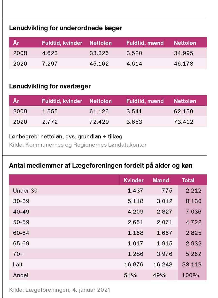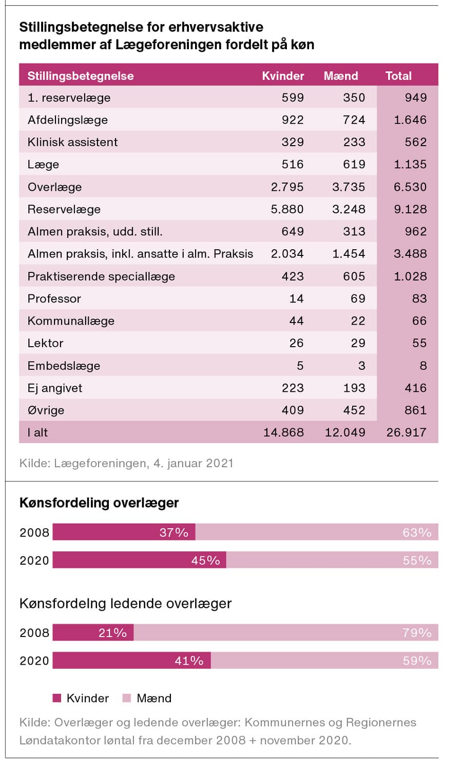 Blandt overlæger er der stadig et lille overtal af mænd. Men kvinder haler ind; tæt på halvdelen er kvinder. Siden 2008 er andelen af kvindelige overlæger steget fra 37 til 45 procent. I samme periode gik andelen af kvindelige ledende overlæger fra 21 til 41 procent. Tallene er opgjort i november 2020.