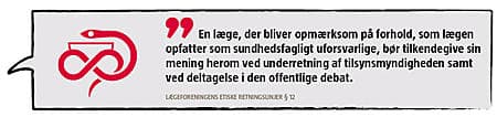 »En læge, der bliver opmærksom på forhold, som lægen opfatter som sundhedsfagligt uforsvarlige, bør tilkendegive sin mening herom ved underretning af tilsynsmyndigheden samt ved deltagelse i den offentlige debat«.