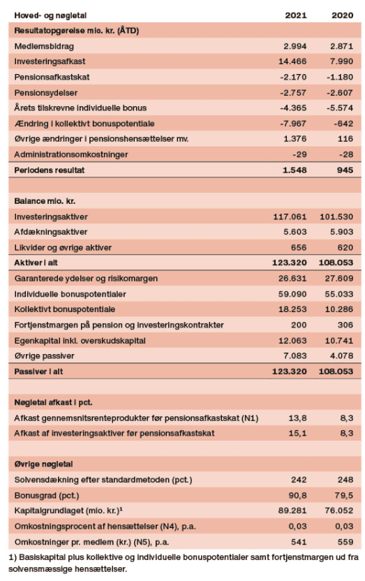 En del af årets afkast gik til kontorenten på 4,25 pct. i den almindelige pensionsordning. Resten af afkastet lægges til side som reserve til senere tildeling. Egenkapitalens andel af afkastet bruges blandt andet til pensionisttillæg. I 2021 fik pensionisterne med den almindelige pensionsordning udbetalt et pensionisttillæg, som forøgede pensionen med 10 pct.