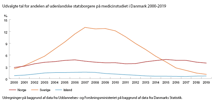 Bekymringen er opstået, fordi norske og svenske medicinstuderende i en årrække har fortrængt danskere. I 2007 udgjorde danske statsborgere således kun 78 procent af de medicinstuderende på de danske universiteter, viser en opgørelse over bestanden af danske og udenlandske statsborgere på medicinstudiet i 2000-2019, som Ugeskrift for Læger har fået fra Uddannelses- og Forskningsministeriet.