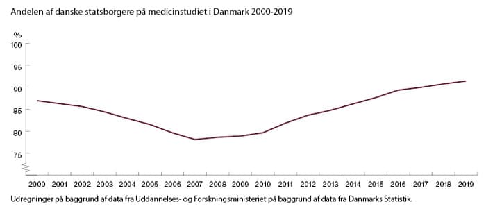Tallene viser imidlertid også, at medicinstudiet i de senere år er blevet stadig mere »danskerdomineret«. I 2019 udgjorde studerende med dansk statsborgerskab således lidt over 91 procent af bestanden på medicinstudiet i Danmark. Den øgede andel af danske statsborgere på medicinstudiet siden midten af 00’erne skyldes stort set udelukkende et voldsomt fald i andelen af svenskere, der læser i Danmark.