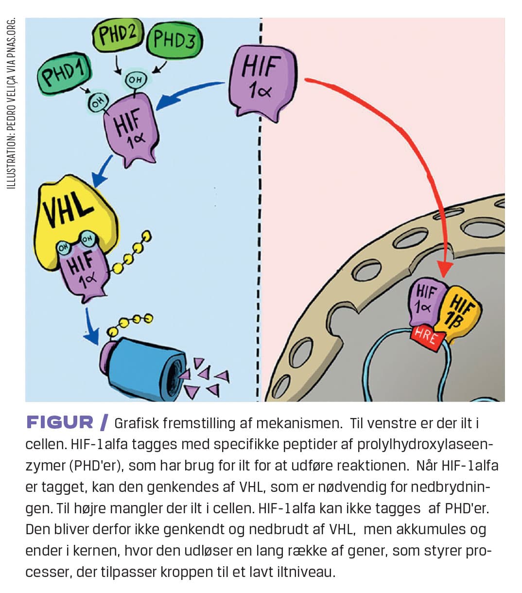 Omvendt, når iltniveauet er lavt, beskyttes HIF-1alfa og akkumulerer i cellen, hvor det aktiverer EPO-genet – og i øvrigt en lang række andre gener, som sætter fart på processer, der tilpasser kroppens celler til det lave iltniveau. Indtil videre har forskerne identificeret over 300 gener, som reguleres af HIF-1alfa, og de bidrager på forskellig vis til at booste kroppens iltforsyning bl.a. ved dannelsen af nye røde blodceller og blodkar.