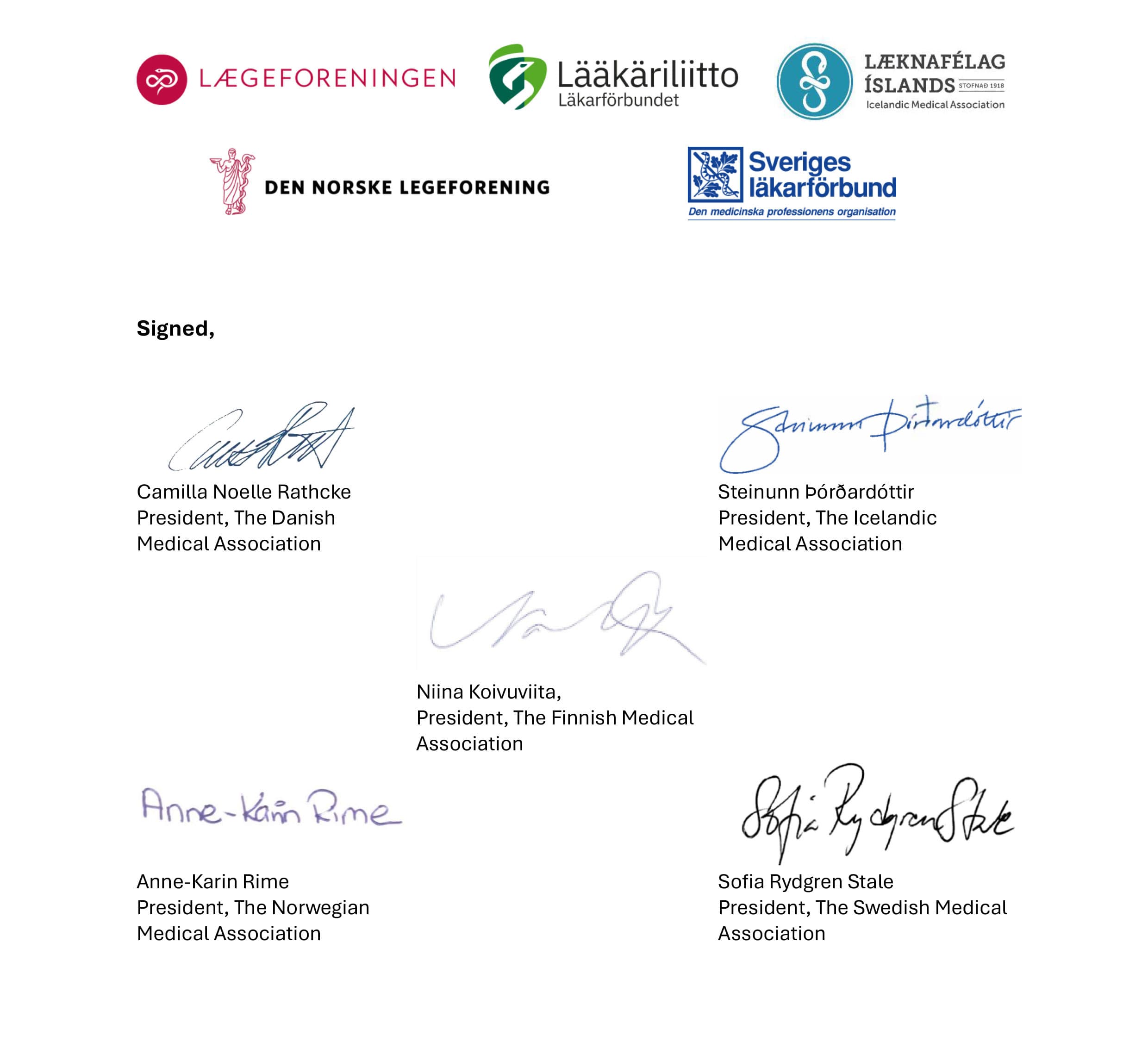 Den er underskrevet af Lægeforeningens formand, Camilla Rathcke, og hendes fire formandskollegaer i finske Lääkäriliitto Läkarförbundet, islandske Læknafélag Íslands, Sveriges Läkarförbund og den norske Legeforening.