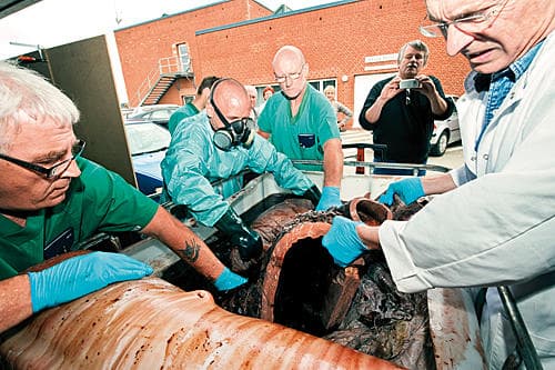 Hvalens hjerte - Forskere fra Århus Universitetshospital, Skejby, har sikret sig hjertet fra den strandede finhval i Vejle Fjord. Med 1. reservelæge, ph.d. Morten Smerup i spidsen (her med åndedrætsværn) skal de undersøge hjertet og bl.a. tage vævsprøver og skanne det 200 kg. tunge hvalhjerte med computertomografi - hvis det ellers kan komme ind i skanneren. »Vi håber at genfinde strukturen fra menneskets hjerte i hvalens. Det kan være med til at skabe en større forståelse for menneskets hjerte«, siger Morten Smerup. Da hjertet ankom til Skejby, kommenterede flere, at »patientens« kranspulsårer ikke viste tegn på forkalkning. Men - som det lød - »han har jo også levet af fisk, og i et helt røgfrit miljø«. (Foto: John Kristensen/Århus Universitetshospital, Skejby)