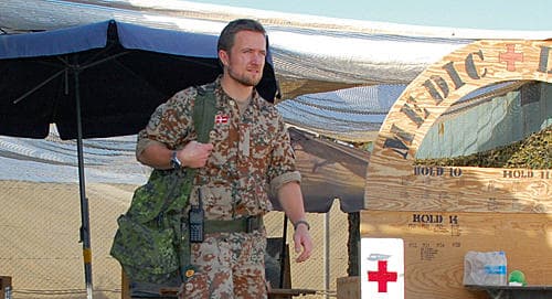 19.00 Vi har en aftale med »Pedro«-drengene, der flyver de amerikanske Black Hawks. Briterne flyver Chinooks og kalder sig Medical Emergency Response Team. I modsætningen til briterne har amerikanerne ikke læge ombord, men derimod meget veluddannede paramedics. Her sidder vi med til deres undervisning i traumemodtagelse. De har altså styr på sagerne.