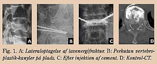 PVP foretages i lokalbedøvelse under let sedation med patienten liggende i bugleje. Under røntgengennemlys- ning føres en kanyle ind i det pågældende hvirvellegeme (Fig. 1 ). Cementen, der er velkendt til fiksering af ledproteser, injiceres under røntgengennemlysning for at sikre en jævn fordeling og for at undgå cementlækage.