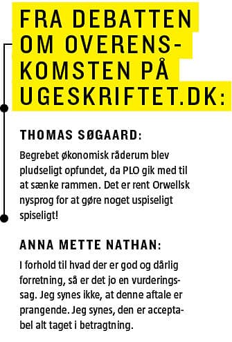 »Hjertet siger klart nej. Men hjernen siger, at man er nødt til at være fornuftig: Kan vi gøre det bedre? Nej, det kan vi ikke. Vil regionerne være med til mere end det, de har dikteret os her? Nej, det vil de ikke. Og det er ikke en overenskomst – det er en leverandøraftale, som vi skriver under på. Hjernen siger, at vi er nødt til at arbejde med det her og få det bedst mulige ud af det.