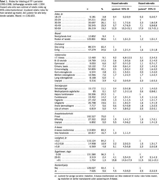 Materiale og metoder: En registerbaseret lukket kohorte på 10% af arbejdsstyrken, i alt 254.905 personer, blev beskrevet med socioøkonomiske indikatorer i november 1994 og fulgt for tilkendelse af FP i fire år fra den 1. januar 1995. Data blev udtrukket fra Danmarks Statistik og Førtidspensionsregistret. Med Cox' regression blev der beregnet hazard rate-ratio som et estimat af den relative risiko for tilkendelse af FP.