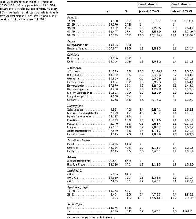 I løbet af den fireårige opfølgningsperiode fik 4.443 personer tildelt FP. Bivariat og justeret relativ risiko er anført i Tabel 1 for mænd og Tabel 2 for kvinder. I den bivariate analyse fandtes tilkendelse af FP at være stærkest forbundet med længerevarende sygemelding, hvor personer med mere end 13 ugers sygemelding i 1994 havde en ca. 16 gange forøget risiko for FP i de næste fire år, i forhold til personer, der havde mindre end fire ugers sygemelding i 1994. Høj alder og kort skolegang øgede risikoen for FP 10-20 gange. I den multivariate analyse fandtes alle variable statistisk signifikant forbundet med tilkendelse af FP, fraset A-kasse-tilknytning hos mænd. Høj alder viste sig at være den mest betydende indikator for FP, når der justeredes for de øvrige variable, så 50-59-årige havde en 17-21 gange højere risiko end 20-29-årige. Omkring en tredjedel af kohorten var enlige, og de havde en 1,4-1,6 gange højere risiko for FP end samlevende og gifte. Knap 10% af både mændene og kvinderne havde kort skolegang (maks. syv år) og ingen erhvervsuddannelse, hvilket gav 3-4 gange større risiko for FP end for personer med lang videregående uddannelse. For hvert stigende trin i uddannelseskategori faldt risikoen for FP hos både mænd og kvinder. Blandt personer, der kunne indplaceres i socialgruppe, havde især selvstændige og ufaglærte øget risiko for tildeling af FP. Faglærte kvinder havde i modsætning til faglærte mænd ikke signifikant øget risiko for FP. For kvinder betød manglende medlemskab af A-kasse en 80% øget risiko for FP, hvilket ikke kunne genfindes for mænd. Modtagelse af overførselsindkomst (sygedagpenge, arbejdsløshedsunderstøttelse eller kontanthjælp) øgede risikoen for FP hos begge køn. Især langvarig udbetaling af sygedagpenge skilte sig ud som en betydelig risikofaktor, der øgede risikoen for tildeling af FP ca. 11 gange hos begge køn.