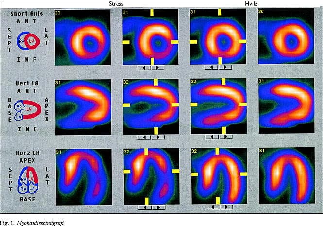 Patienten er en 50-årig mand med diabetes mellitus og atypiske brystsmerter. Arbejds-ekg'et er ikke sikkert konklusivt. Patienten henvises til myokardiescintigrafi. Fig. 1 viser resultatet af myokardiescintigrafien. Helt til venstre i billedet er det skematisk vist, hvordan snittene er lagt gennem venstre ventrikel. ANT = anterior, LAT = lateral, INF = inferior, SEPT = septal. Helt til højre i billedet er lagt en farveskala, hvor sort farve svarer til en relativ perfusion på 0%, og hvid farve svarer til en relativ perfusion på 100%. De fire rækker billeder er snitbilleder gennem hjertet. I de to venstre lodrette søjler ses myokardiets perfusionfordeling under en submaksimal arbejdstest (maks. puls = 85% af forventet) og i de to højre, lodrette søjler ses myokardiets perfusionsfordeling i hvile.