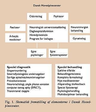 Det har været klart i mange år, at der er behov for mere specialiserede enheder til de sjældne eller svært behandlelige hovedpinepatienter. I Dansk Neurologisk Selskabs referenceprogram om hovedpine, som udkom i 1994, foreslog man da også oprettelse af en landsdelsfunktion på Amtssygehuset i Glostrup. I 2001 lykkedes det endelig at få etableret et sådant højt specialiseret center for hovedpinediagnostik og hovedpinebehandling, Dansk Hovedpinecenter, knyttet til den neurologiske universitetsafdeling ved Amtssygehuset i Glostrup. Oprettelsen skete på baggrund af 20 års hovedpineforskning i den internationale frontlinje, og centret har derfor kunnet bemandes med læger med langvarig forskningserfaring inden for hovedpinesygdommene. Centret har endvidere egne specialsygeplejersker, psykologer og fysioterapeuter. Centret har landsdelsfunktion, men fungerer også som basisafdeling for Københavns Amt. Patientindtaget i 2001 var 600 nye patienter, og fra og med 2003 har centret kapacitet til færdigbehandling af 1.000 nye patienter pr. år. Alle patienter ses først af en neurolog, og derefter kan de, afhængigt af deres problemer, gennemgå forskellige forløb som skitseres i Fig. 1 . Godt halvdelen af patienterne færdigbehandles rent lægeligt, mens knap halvdelen får fysioterapeut- eller psykologterapi eller indgår i en hovedpineskole, der forestås af en specialsygeplejerske. Hovedpineskolen tager sig af den overraskende store gruppe af patienter, der har et væsentligt medicinoverforbrug, der paradoksalt medvirker til at vedligeholde hovedpinen, den såkaldt medicinfremkaldte hovedpine. Centret var fra starten tænkt som udelukkende daghospitalsbaseret, men det har vist sig, at en række meget svære tilfælde kræver indlæggelse. I første omgang er der etableret to faste senge til hovedpinepatienter, men det står allerede nu klart, at kapaciteten er utilstrækkelig. Næste skridt bliver forhåbentlig udvidelse til seks hovedpinesenge med to forskellige patientforløb, et forløb for patienter, der indlægges til afvænning, og et andet forløb for patienter, der ikke har noget overforbrug, men som har brug for et intensivt observations- eller behandlingsforløb under indlæggelse. Etableringen af Dansk Hovedpinecenter som tredje led i behandlerpyramiden for hovedpinepatienter er efter Dansk Hovedpine Selskabs opfattelse et markant fremskridt i behandlingsmulighederne for patienter med meget svære og/eller sjældne hovedpinesygdomme i Danmark.