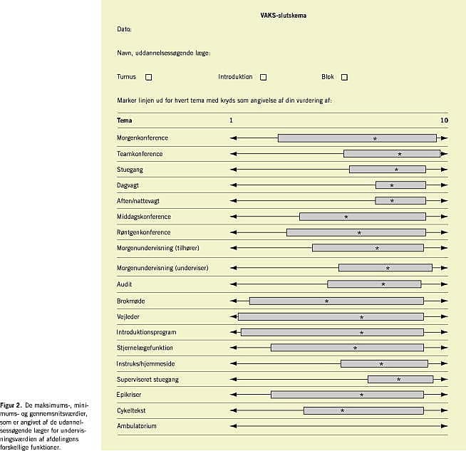 Ved vurderingen af afdelingen som uddannelsessted har vi udvalgt de vigtigste arbejdsområder og funktioner, som turnuslægerne deltager i. Karaktergivning blev igen foretaget vha. en visuel analog-skala. Der var stor spredning af vurderingerne (Figur 2).