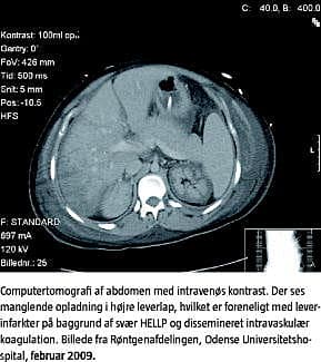 Summary Sixteen-year old woman with multiorgan dysfunction after HELLP Ugeskr Læger 2010;172(9):716-717 HELLP is a syndrome with haemolysis, elevated liver enzymes and thrombocytopenia. It occurs in 1 to 6 per 1,000 parturient. Approximately 10% of the cases occur post partum. A 16-year-old woman delivered twins in the 34th gestational week. During the following hours, she developed symptoms of hypovolaemic shock. Blood sample values were critical and the patient was diagnosed with HELLP with DIC. She developed liver shock with encephalopathy and acute renal failure. Her condition stabilized on the 8th day of admission and the woman was extubated on the 16th day. She was discharged without complications on the 22th day.