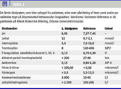 Der udkom svært påvirkede arterieblodgasværdier og blodprøver (se Tabel 1 ), bl.a. laktatacidose (ph 6,95, laktat 12 mmol/l), anæmi (5,5 mmol/l), laktatdehydrogenase (> 2.500 E/l) og trombocytopeni (8 × 10E9). Endvidere var der svært påvirkede hæmostasetal med lave koagulatiosfaktorer II, VII, X (0,13) og antitrombin (0,15) samt fibrin d-dimer (> 100) og blødningstid (> 200 sekunder). Patienten havde HELLP kompliceret med DIC, og hun blev overført til intensiv afdeling. Her blev patienten behandlet symptomatisk i respirator og substitueret med blod- og koagulationskomponenter (erytrocytter, plasma, trombocytter og antitrombin 3).