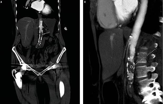 En 77-årig kvinde med kronisk obstruktiv lungesygdom, systemisk lupus erythematosus, kroniske lænderygsmerter og tidligere apopleksi blev indlagt via Falck pga. pludseligt opstået nedsat kraft og sensibilitet samt smerter i højre crus. Patienten havde claudicatio. Objektivt vurderet var hun vågen, klar og velorienteret ved ankomsten. Den højre underekstremitet var lidt bleg, kølig og pulsløs. Hun blev tiltagende dårlig med kraftig progrediering af forløbet over få timer, hvor begge ben blev fuldstændigt kølige, blåmarmorerede og paretiske. Der blev foretaget CT af abdomen på mistanke om aortaaneurisme, men skanningen viste tromboseret aorta abdominalis 2 cm distalt for afgangen af nyrearterierne. A. Trombe i aorta abdominalis i koronalt plan. B. Trombe i aorta abdominalis i sagittalt plan. Patienten blev overflyttet til en karkirurgisk afdeling og gik ad mortum kort tid efter.