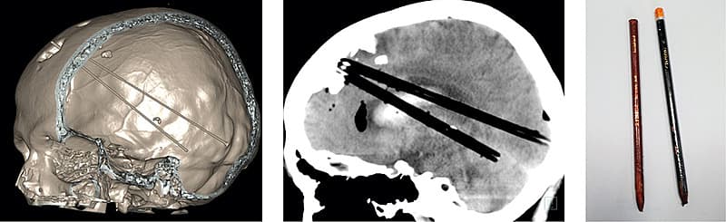 En 38-årig mand havde mast to blyanter gennem en eksisterende frontal kraniedefekt, som han ikke tidligere havde ønsket lukket. Han var efter akut overflytning vågen, vurderet psykotisk og uden oplagte neurologiske udfald. Blyanterne var ladt in situ. En CT af cerebrum viste begge blyanter, der strakte sig fra mesialt i venstre frontallap til højre occipitallap og højre cerebellare hemisfære, sidstnævnte via tentorium cerebelli.