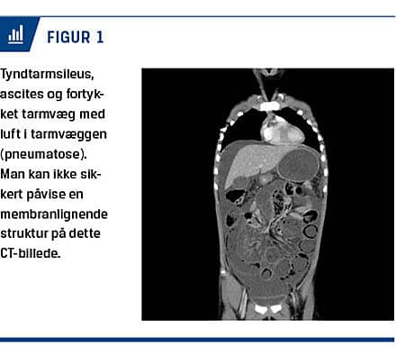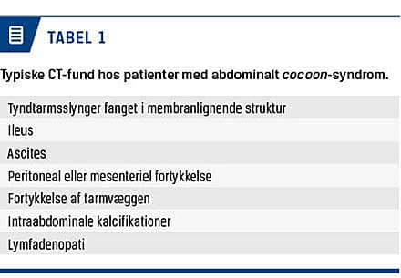 en puls på 140 slag/min, og en venøs gasanalyse viste følgende værdier: pH = 6,72, baseoverskud = –26,3 mmol/l, laktatkoncentration = 15 E/l, hvilket indikerede svær metabolisk acidose. Der blev initieret væsketerapi med isotonisk NaCl, og hendes tilstand rettede sig umiddelbart på denne behandling. På mistanke om ileus (abdominal katastrofe) blev der ordineret akut CT af abdomen. CT’en viste tyndtarmsileus, ascites og muligvis luft i tarmvæggen (pneumatose) (Figur 1). Der blev udført akut diagnostisk laparoskopi, hvor man konstaterede sort tarm. Man måtte konvertere til eksplorativ laparotomi, hvor man fandt to meter gangrænøs tyndtarm fanget i en broksæklignende struktur, der udgik fra mesenteriet. Dertil sås blodig ascites, men ingen perforation. Man receserede det gangrænøse stykke tyndtarm og blindtarmen (pga. fækulit), fjernede den membranstruktur, der havde afklemt tarmen, og anlagde en ileostomi. Der var to meter tyndtarm fra Treitz’ ligament til ileostomien. Man vurderede peroperativt, at der var tale om ACS, hvilket blev bekræftet af den histologiske undersøgelse, der viste, at membranen fra cocoon’en bestod af fibrøst bindevæv. Desuden fandt man iskæmisk nekrose af det receserede tyndtarmssegment og appendix uden inflammation men med fækulit.