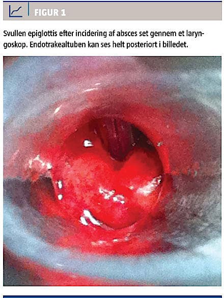40 °C i feber. Hans tale var normal, og der var ingen stridor. En fleksibel fiberlaryngoskopi viste en svullen epiglottis med absces og intet indblik til plicae vocales (Figur 1). Patienten blev akut nasotrakealintuberet efterfulgt af incision af abscessen. Der blev podet fra abscessen til mikrobiologisk dyrkning. Patienten blev i den akutte fase behandlet med intravenøs methylprednisolonsuccinat 80 mg som engangsdosis, herefter fik han intravenøst givet cefuroxim 1.500 mg tre gange dagligt i fem dage efterfulgt af peroralt givet amoxicillin/clavulansyre 500 mg fire gange dagligt i yderligere ti dage. Han blev ekstuberet tre dage postoperativt og udskrevet fra hospitalet uden sequelae efter i alt fem dages indlæggelse. Dyrkning fra