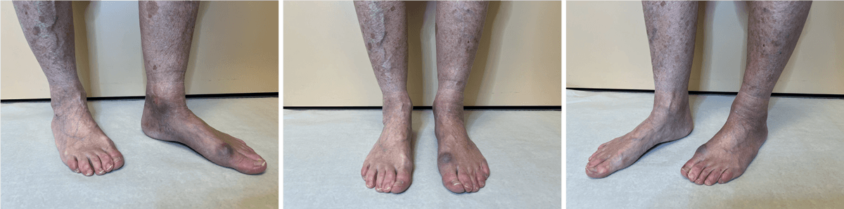 En 76-årig kvinde blev henvist til dermatologisk vurdering med tre års varende smerter og hævelse i venstre ben. Hun var tidligere udredt af en ortopæd og en neurolog samt have fået udført MR-skanning af benet og neurografi uden sikre tegn på perifer neuropati. Det seneste år havde tiltagende hævelse medført, at hun måtte bruge forskellige skostørrelser. Ved undersøgelse sås rødviolet misfarvning med hudatrofi, hævelse og induration over venstre ankel og fod. En serologisk test viste isoleret forhøjet IgG for Borrelia burgdorferi, og en PCR-undersøgelse af hudbiopsi bekræftede B. burgdorferi-DNA. Acrodermatitis chronica atrophicans (ACA), en sen kutan manifestation af borreliose, blev diagnosticeret, og behandling med doxycyclin 100 mg × 2 i tre uger medførte symptombedring. ACA er sjælden og overses let, især hos ældre [1]. Tilstanden ses hyppigere hos kvinder og debuterer tit med rødviolet misfarvning og hævelse på ekstensorsider af ekstremiteter – typisk fødder eller hænder – efterfulgt af fibrose og hudatrofi. Ledsagende hydrops i knæ eller ankel forekommer ikke sjældent [2]. ACA bør overvejes ved kronisk hævelse, hudforandringer og neuropatiske symptomer. Tidlig diagnose og behandling kan forhindre irreversible vævsskader.