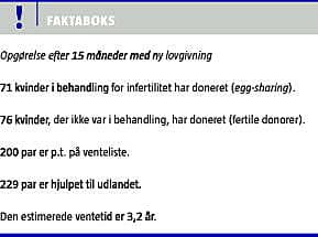 Opgørelsen viser imidlertid også, at der aktuelt i Danmark står mindst 200 par på venteliste til ægdonation, og at den gennemsnitlige ventetid på behandling er 3,2 år. I de forgangne 15 måneder er yderligere 229 par via danske fertilitetsklinikker blevet vejledt og hjulpet til ægdonation i udlandet. Sidstnævnte tal vurderer Landsforeningen for ufrivilligt barnløse til 300-600 par [4] årligt, da en del par søger til udlandet uden vejledning fra danske klinikker. Prisen pr. behandling på udenlandske klinikker varierer mellem 30.000 og 70.000 kr. ekskl. rejseomkostninger og ophold [4].