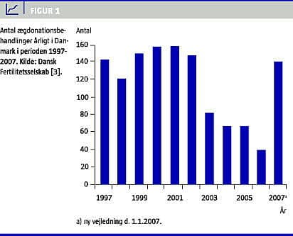 Som det fremgår af Figur 1 , blev der i perioden 1997-2002 udført i gennemsnit 150 ægdonationer årligt [3]. Herefter faldt tallet jævnt, og i 2006 blev der på landsplan kun udført 35 ægdonationsbehandlinger. Til sammenligning blev der samme år i Danmark gennemført lige knap 10.000 ægudtagninger mhp. reagensglasbefrugtning eller mikroinsemination [3]. Årsagen til faldet skyldes flere ting: dels en tendens til mildere hormonstimulation og dermed færre udtagne æg til egen anvendelse hos en potentiel donor - dels en optimering af fertilitetsklinikkernes fryseprogrammer, hvor parrenes »overskudsembryoner" i højere grad end tidligere blev nedfrosset mhp. senere egen anvendelse. Konsekvensen har været en forståelig men reduceret motivation hos par, der er i behandling for barnløshed, til at donere æg til andre par.