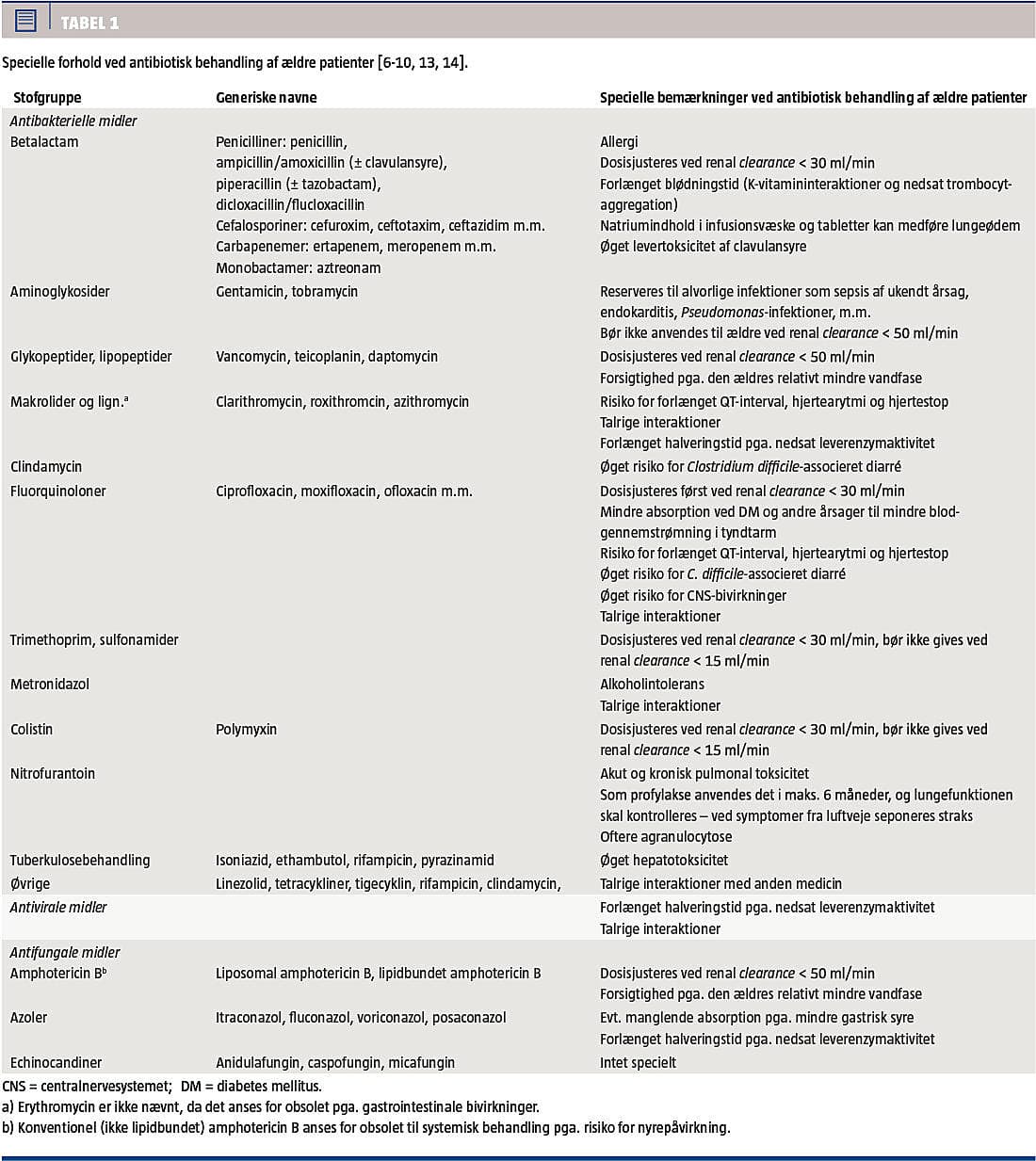 For de fleste antibiotika ses kun sjældent toksiske bivirkninger, formentlig fordi behandlingsvarigheden oftest er kort; det rapporteres imidlertid generelt, at de fleste bivirkninger, sjældne eller hyppige, ses oftere hos ældre end hos yngre patienter [6-10]. Dette kan delvis forklares med de med alderen fysiologiske forandringer af kroppen og organfunktionerne, som ovenfor nævnt (Tabel 1).