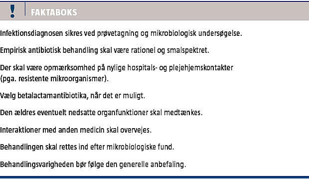 Det skal pointeres, at det er specielt vigtigt i behandling af den store gruppe ældre patienter at følge den danske nationale antibiotikapolitik, som er beskrevet i »Vejledning om ordination af antibiotika«, der er udgivet af Sundhedsstyrelsen i 2012 [12], hvor vigtigheden af rationel anvendelse af antibiotika fremhæves, og man netop påpeger, at smalspektret antibiotisk behandling må bygge på en sufficient påvisning af ætiologien ved mikrobiologisk og/eller biokemisk undersøgelse.