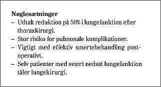 Postoperative ændringer i lungefunktionen efter torakale og øvre abdominale operationer er velkendte, og pulmonale komplikationer er en af de vigtigste årsager til postoperativ morbiditet og mortalitet hos denne gruppe patienter (1).