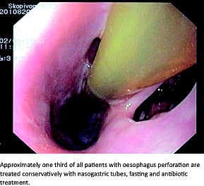 Øsofagusperforation er fortsat en diagnostisk og behandlingsmæssig udfordring. Hurtig diagnose og behandling afkorter sygdomsforløbet og nedsætter mortaliteten. De seneste års konsensus om hurtig behandling med torakotomi, débridement , irrigation og efterfølgende parenteral ernæring har forbedret overlevelsen. I dette materiale er de fleste perforationer af iatrogen art, hvilket svarer til fundene i øvrige opgørelser. Opgørelsen viser, at for 29% af patienterne er iatrogen perforation sket med det rigide skop. Hovedparten af de patienter, der blev overflyttet til thoraxkirurgisk afdeling, gennemgik et kirurgisk indgreb, hvorimod færre blev behandlet konservativt. Rapporter fra øvrige opgørelser viser den samme fordeling i behandlingsmodaliteter. Der er inden for de seneste år beskrevet brug af stenter i behandlingen af øsofagusperforationer med acceptable resultater.