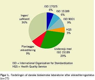 Men der er faktisk en lille snes danske klinisk biokemiske afdelinger, som i løbet af de seneste fem år har fået akkrediteret deres aktiviteter efter nogle standarder, som er udviklet af International Organization for Standardization (ISO) og her især: »Generelle krav til prøvnings- og kalibreringslaboratoriers kompetence« (ISO 17025) og den nyere »Medicinske laboratorier - Særlige krav til kvalitet og kompetence« (ISO 15189) [1], og flere afdelinger er i gang med det forberedende arbejde til akkrediteringer efter den sidstnævnte standard (Figur 1 ).