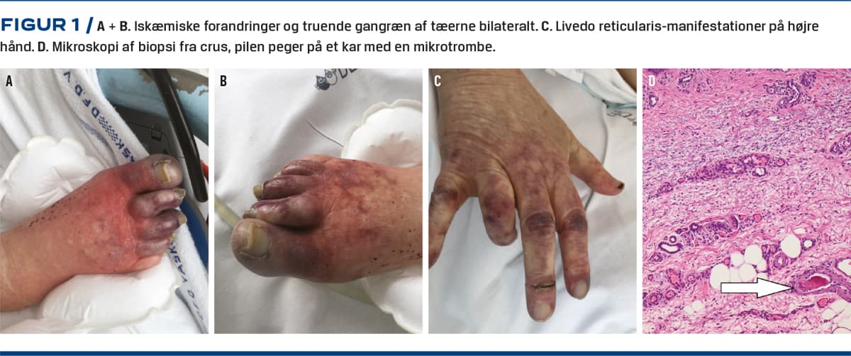 Tilstanden mindede umiddelbart om dissemineret intravaskulær koagulation (DIC), men patienten var ikke hypotensiv eller septisk og havde hverken metabolisk eller respiratorisk acidose. Hun havde i modsætning til ved klassisk DIC trombocytose, forhøjet fibrinogenniveau og ekstremt forhøjet D-dimerniveau, hvilket tyder på aktivering af koagulationssystemet. Ved en transtorakal ekkokardiografi fandt man ikke en oplagt embolikilde. Der blev ikke foretaget transøsofageal ekkokardiografi (TEE). Distal blodtryksmåling viste normalt tryk på ankelniveau, men tryk kunne ikke måles på tåniveau pga. smerter. Stansebiopsi af elementer på crus viste trombedannelse, der okkluderede flere kar. Endotelcellerne var kun stedvist reaktivt påvirkede og uden inflammatoriske celler i karvæggene (Figur 1D). Øvrige blodprøver var uden tegn på systemisk autoimmun lidelse (Tabel 1).Behandling med tinzaparin, antibiotika samt anden understøttende behandling fortsatte, og på sjettedagen bedredes patientens akrale iskæmi og almene tilstand. Hun blev udskrevet COVID-19-negativ i trakealsekret og podning på 20.-dagen. Hun blev genindlagt med pneumoni 20 dage efter udskrivelsen. På dette tidspunkt sås der tørre nekroser på tæerne med begyndende demarkation og med puls i aa. dorsales pedes.