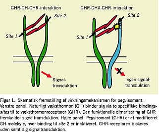 Væksthormonreceptorantagonisten pegvisomant er resultatet af en enkelt forskergruppes undersøgelse af alternative regioner på væksthormonmolekylet af potentiel betydning for dets binding til receptoren [5]. På daværende tidspunkt var et sådant område identificeret, men den eksakte interaktion mellem hormon og receptor var ukendt. Interessen samlede sig om den tredje af molekylets fire α -helices, som var påvist at have en svag vækstfremmende aktivitet. Når denne helix projiceres todimensionalt, danner aminosyrerne en ring, hvor de hydrofile og hydrofobe aminosyrer udgør hver sin adskilte halvdel, en såkaldt amfifil orientering. Tre aminosyrer er imidlertid »fejlplacerede«. Forskerne arbejdede ud fra hypotesen om, at en dannelse af en perfekt amfifil α -helix ville resultere i en væksthormonanalog med øget biologisk aktivitet. Et mutant væksthormongen, som kodede for de relevante aminosyresubstitutioner blev fremstillet og efterfølgende udtrykt i en transgen mus. Musen viste sig imidlertid at blive en fænotypisk dværg med lave cirkulerende IGF-I-niveauer. Ydermere hæmmede det mutante væksthormon binding og biologisk effekt af nativt væksthormon in vitro. Efterfølgende studier viste, at blot en af de tre aminosyrer (glycin-120) var kritisk for denne effekt, og at substitution af glycin-120 med enhver anden aminosyre end alanin ændrede molekylet til en væksthormonantagonist. Forskerne tog straks patent på opdagelsen, men den videnskabelige anerkendelse lod vente på sig. Anerkendelsen kom, da en anden forskergruppe viste, at et væksthormonmolekyle binder sig til to væksthormonreceptorer [6], og at det ene af væksthormons to bindingssteder (site 2) netop er området omkring glycin-120 (Figur 1 ). I sin kommercielle form (pegvisomant) er molekylet yderligere modificeret med aminosyresubstitutioner ved bindings-site 1 og konjugering af polyethylenglycolmolekyler (pegylering) for at forlænge halveringstiden.
