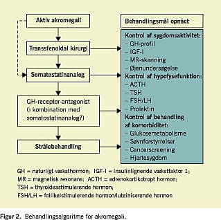 Med fremkomsten af væksthormonreceptorantagonisten pegvisomant er det nu realistisk at opnå en sufficient hæmning af væksthormons perifere virkninger hos næsten alle akromegale patienter. Derimod yder pegvisomant ingen hæmning af tumoraktiviteten, teoretisk måske snarere tværtimod. En mere håndgribelig ulempe ved pegvisomant er behandlingsprisen, som er mere end det dobbelte af prisen for somatostatinanaloger. Samtidig behandling med en somatostatinanalog er ud fra en teoretisk synsvinkel attraktiv, idet hæmning af tumoraktivitet kombineres med effektiv perifer blokade af væksthormons vækstfremmende og insulinantagonistiske effekter. De præliminære erfaringer støtter dette koncept, og ydermere synes kombinationsbehandling at være omkostningseffektiv ved at nedsætte behovet for pegvisomant. For nærværende foreslås det, at pegvisomantbehandling fortrinsvis gives til patienter, som enten ikke tåler eller ikke responderer på somatostatinanaloger, mens kombinationsbehandlingen kun anvendes i udvalgte tilfælde. Strålebehandling vil være indiceret hos patienter med fortsat sygdomsaktivitet trods kirurgisk og medicinsk behandling. Der henvises i øvrigt til Figur 2 , som viser den foreslåede algoritme for behandling og kontrol, men som det fremgår af artiklen, må behandlingen ofte individualiseres.